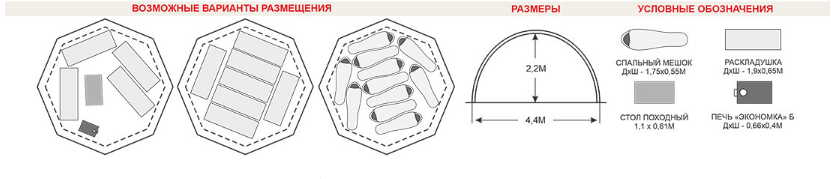 Вместимость палатки до 11 человек при условии размещения в спальных мешках, без установки отопительного прибора (печи).
