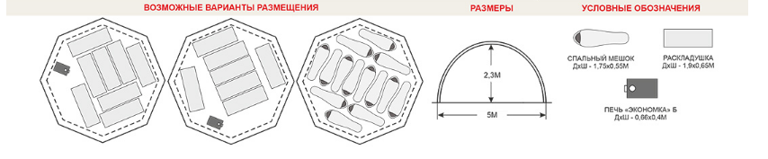 Вместимость палатки до 14 человек при условии размещения в спальных мешках, без установки отопительного прибора (печи).